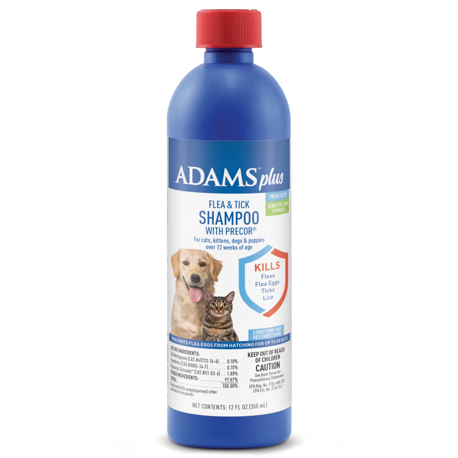 Adams plus flea and tick shampoo with Precor is a sensitive skin flea and tick shampoo that kills fleas, ticks, and lice on contact. Our rich, creamy formula cleans and conditions your pet’s coat leaving it soft, shiny, and manageable. It’s enriched with soothing aloe Vera, lanolin, and oatmeal with a pleasant, fresh scent while controlling flea re-infestation for up to 28 days.
