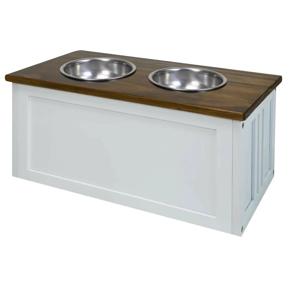 Inspired by the classic two tone theme of farmhouse style furniture, our pet feeder storage stand is a simple but pleasant addition for both your pet and home. The top piece is stained in our pet safe warm brown finish and fit with 2 removable aluminum bowls for food or water. Flip up the top to find plenty of convenient storage space for sealed pet food and supplies. Standing at 11 In. tall, this stand is best suited for medium to large sized dogs. Perfect for pet owners who love keeping things neat and organized while still maintaining a well furnished home.