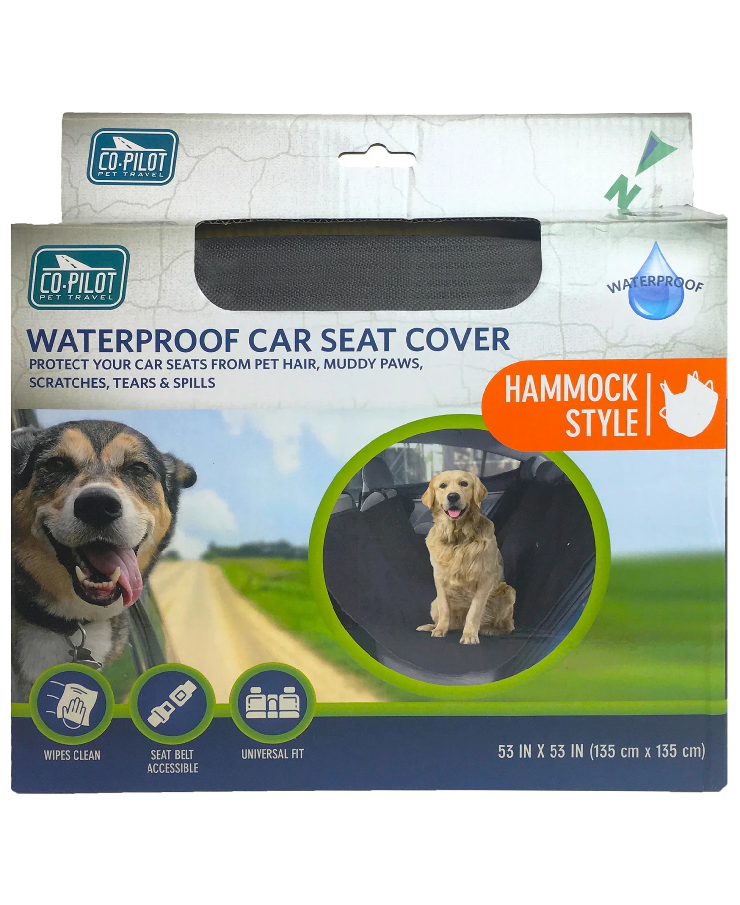The copilot hammock style waterproof car seat cover is made from durable, waterproof polyester. Designed to fit all vehicles, the hammock keeps pets from falling off the seat while it traps pet hair, dirt, and pet “accidents”. An easy on-off design makes this seat protector a breeze to install with its openings for seat belts. Wipes clean.