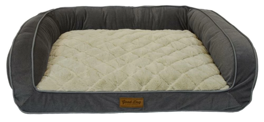 Good Dog Premium 40” Couch Bed with Therapeutic Chipped Memory Foam. Sleep area is deep chipped memory foam in a baffled liner for stability and support. Made with 9” high bolster walls for your pet to snuggle up against to feel safe and secure with 100% Eco Friendly recycled polyester fiber fill. Quilted memory foam lining sewn into plush fur sleep area to ensure a soft bed. Beautiful and durable home d飯r fabrics that look great in any home. Removable cover that is machine washable.