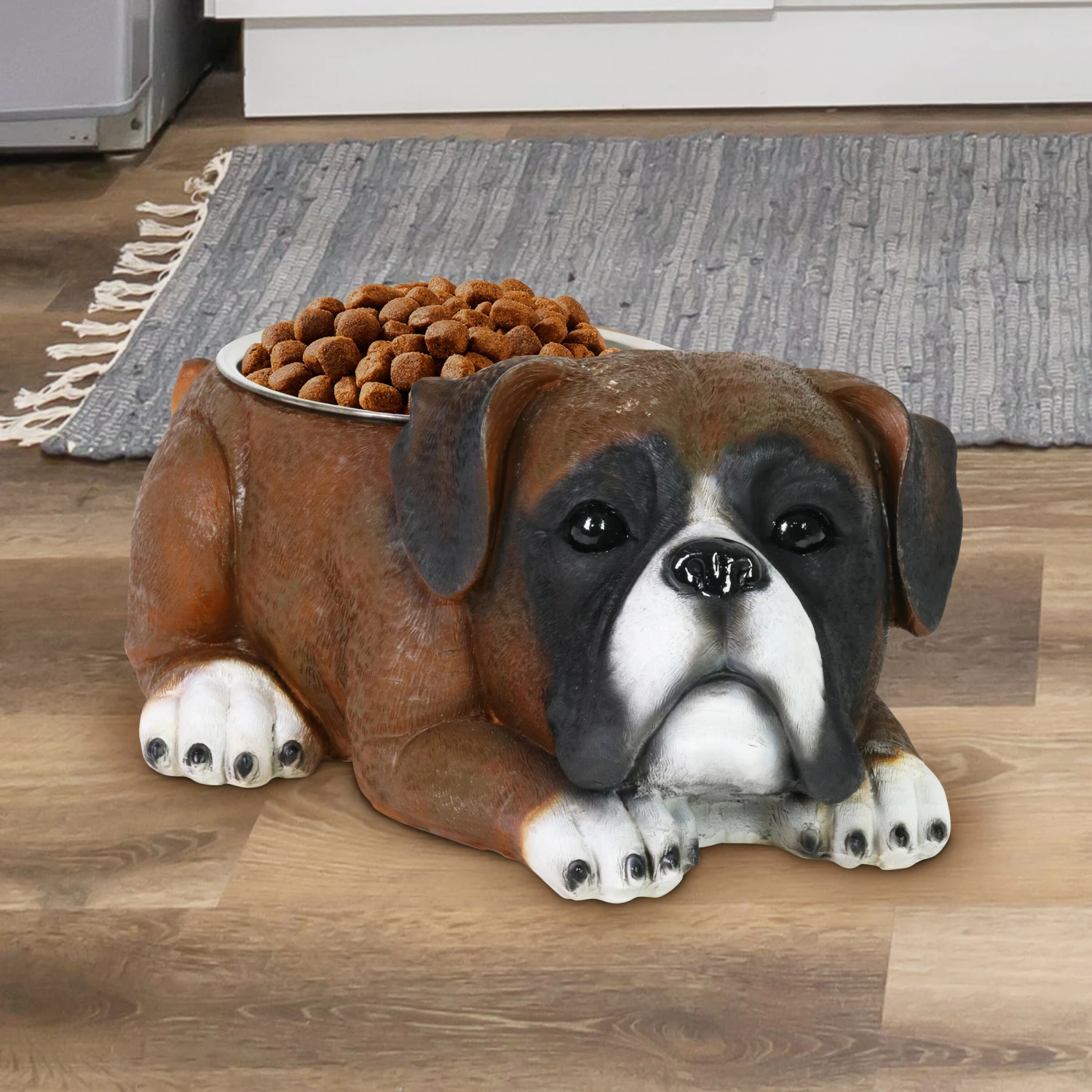 Fido deserves better! Why settle for a boring dog bowl when you can add a burst of personality with this adorable Boxer Bowl? Beautifully hand painted with great detail, you may find yourself doing a double take! A perfectly sized stainless steel bowl is included for your convenience. Add a touch of whimsy and fun to your home with this charming, beautifully crafted home decor by the Exhart family.