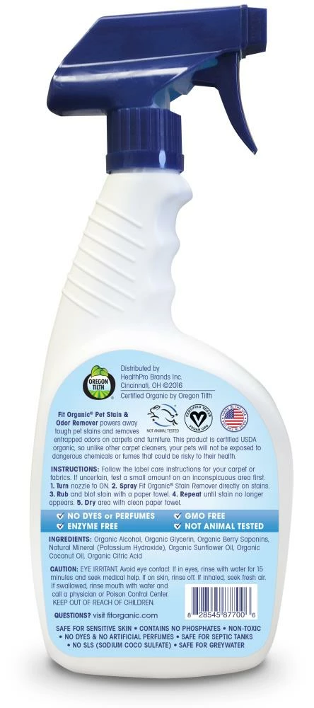 FIT Organic pet stain and odor remover powers away tough stains and removes entrapped odors on carpets and furniture safely and organically. This product is certified USDA organic, so unlike other carpet cleaners, your pet will not be exposed to dangerous chemicals or fumes that could be risky to their health.