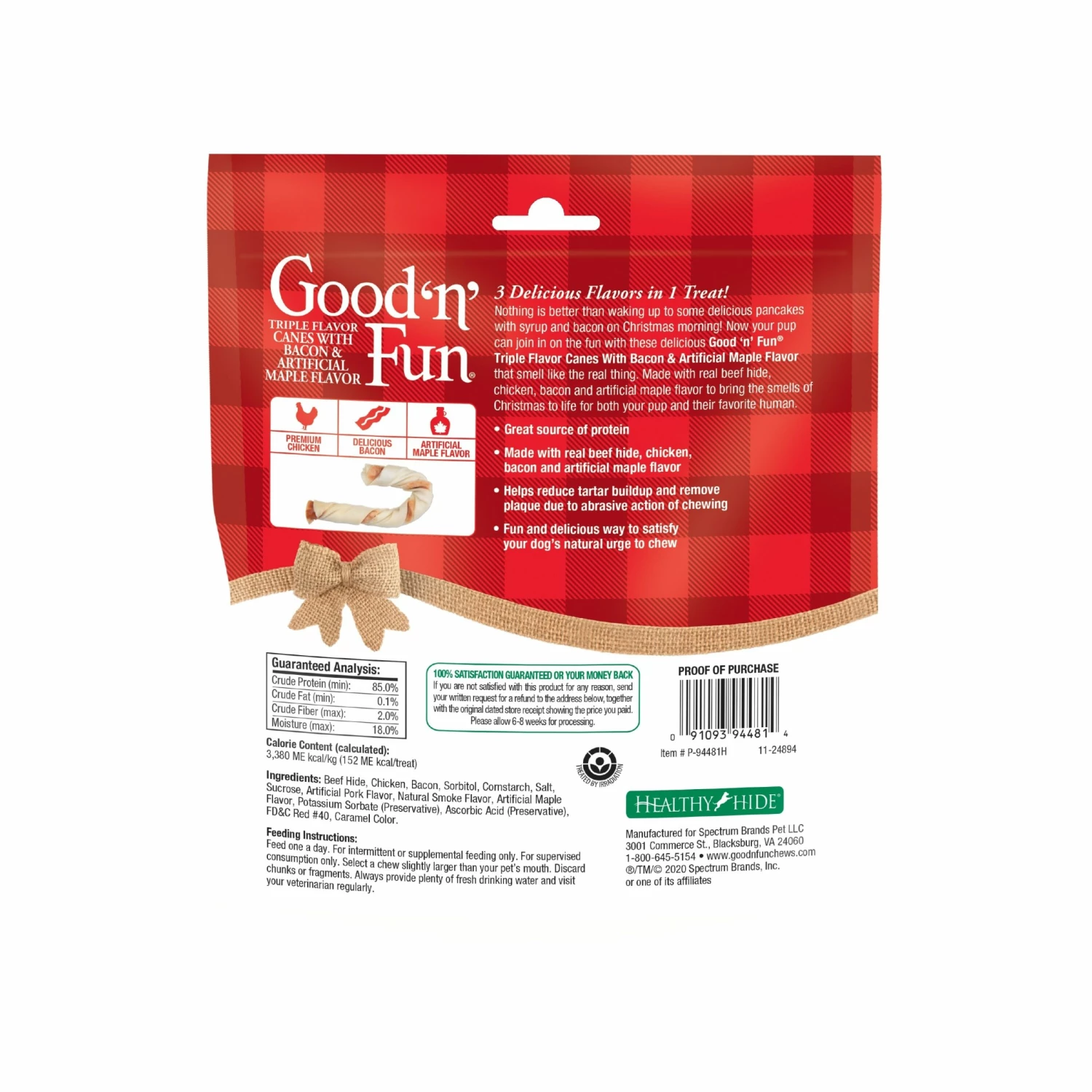 Good ‘n’ Fun® chews offer a tasty variety of flavors that dogs love. These delicious chews are made from the finest ingredients, including beef hide, chicken, bacon and artificial maple flavor, to create truly delightful, long-lasting treats your dog will love. Get your pup in the holiday spirit! Nothing is better than waking up to some delicious pancakes with syrup and bacon on Christmas morning! Now your pup can join in on the fun with these delicious Good ‘n’ Fun® Triple Flavor Canes With Bacon and Artificial Maple Flavor that smell like the real thing. Made with real beef hide, chicken, bacon and artificial maple flavor to bring the smell of Christmas morning to life for both your pup and their favorite human. Feed one chew per day. Intended for intermittent or supplemental feeding only. For supervised consumption only. Select a chew slightly larger than your pet’s mouth. Discard chunks or fragments. Always provide plenty of fresh drinking water and visit your veterinarian regularly. We know your dog will love the great taste.