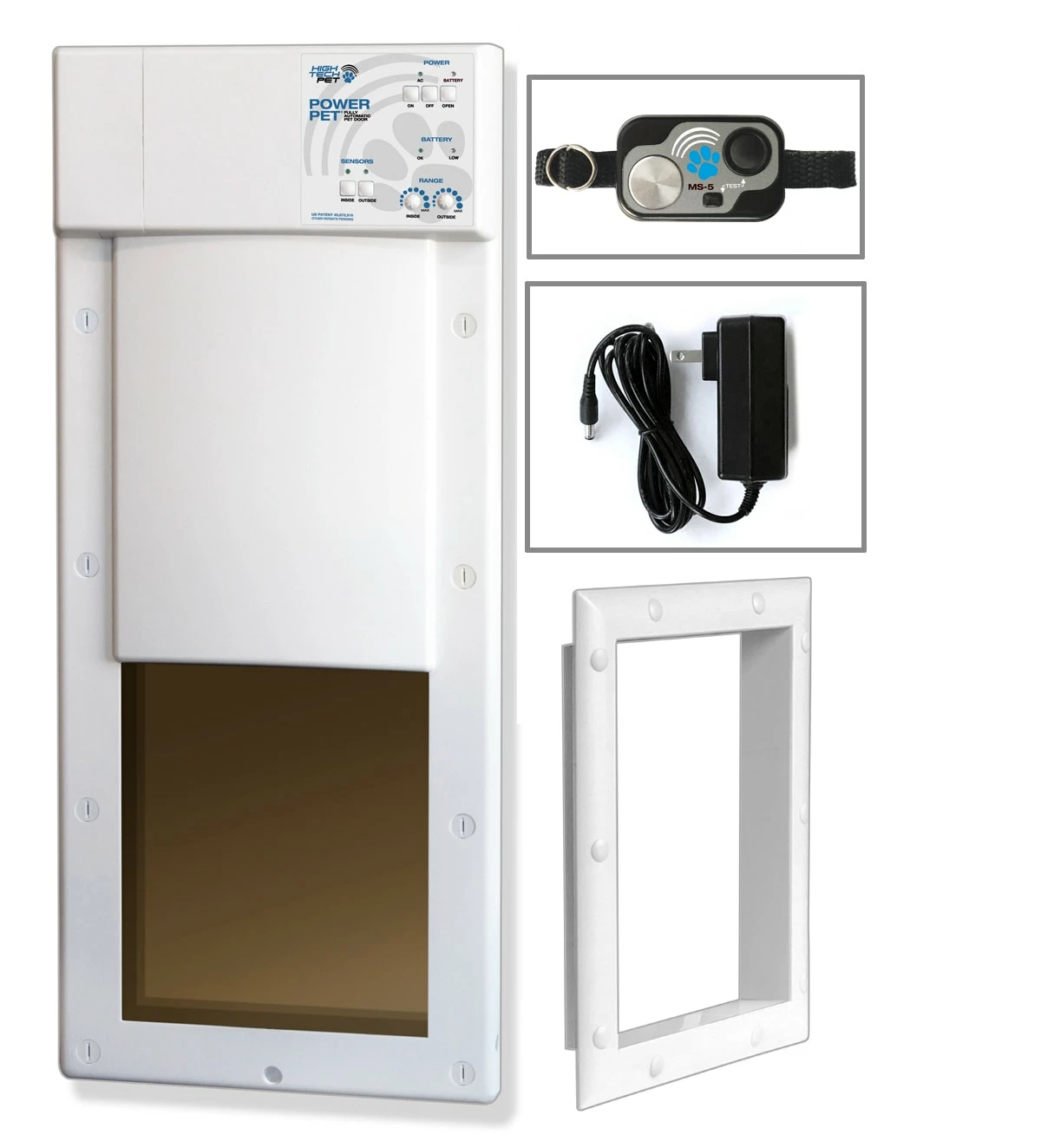Engineered for performance, value and extreme reliability, Power Pet doors are motor driven and activated by a tiny ultrasonic collar. Other electronic pet doors merely unlock a hinged panel, requiring your pet to push it open. That’s something that a lot of pets don’t like to do. Patented Power Pet doors open completely under their own power. They feature a translucent door panel made of a new super-strength, bulletproof resin. When your pet approaches, the air-tight panel quickly and quietly powers upward disappearing into the stylish housing. Because the panel moves up and down and does not swing out, it can mounted in hermetically sealed grooves for air-tight closure. This mounting arrangement makes it impossible for an intruder to kick it out. The result is the most secure pet door against intruders and stray animals. Your pets are empowered to come and go as they please while their animal friends are politely asked to stay out. Panel size: 12-1/4 in. x 16 in. for pets up to 100 lbs.