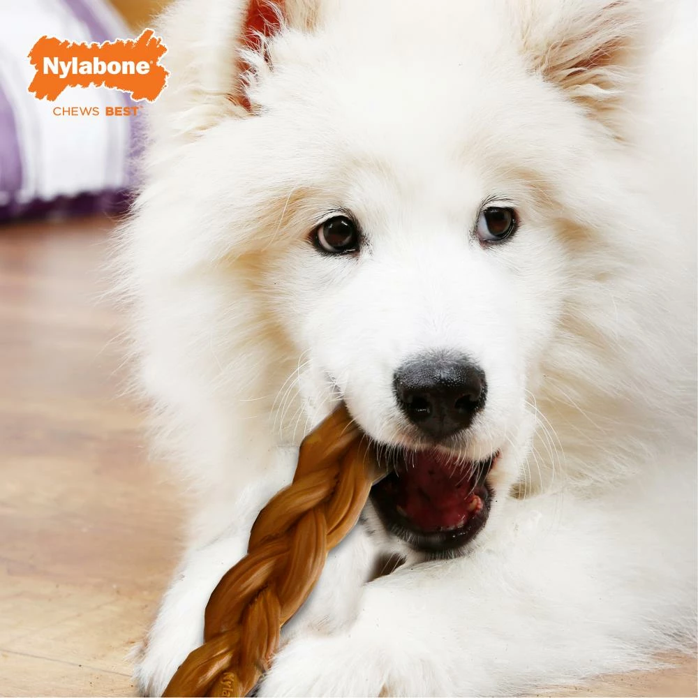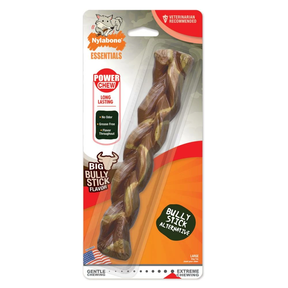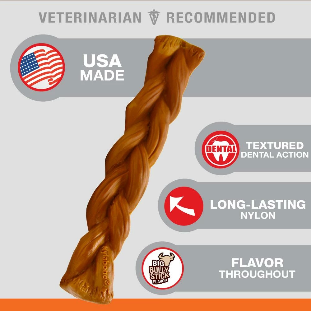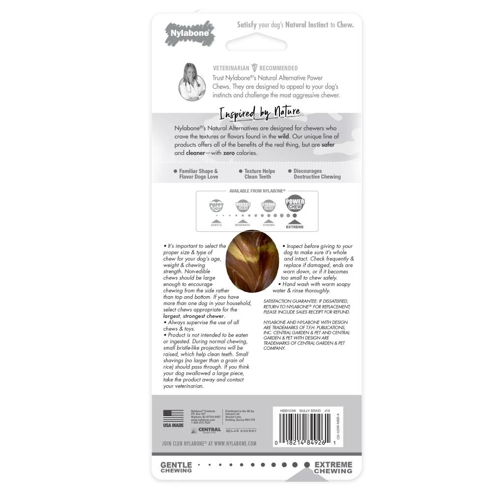 For over 60 years, Nylabone has been creating dog chew toys in a variety of shapes, textures, and sizes to satisfy every fur pal. From our unique line of Natural Alternatives, this Power Chew Braided Bully Stick Alternative is cleaner and safer than real bully sticks and offers all the same benefits—with no grease or odor. Its authentic braided shape and savory, calorie-free bully stick flavor will indulge your dog’s craving for real animal parts. Created just for power chewers, this long-lasting dog chew toy is made of durable nylon. It will help discourage destructive chewing, satisfy your furry friend’s instinctive chewing urge, and keep them entertained. Plus, this USA-made Power Chew features a subtle textured surface that promotes dog oral health by naturally helping clean teeth and freshen breath as your best friend chews! This large dog chew toy is created for dogs up to 50 pounds.