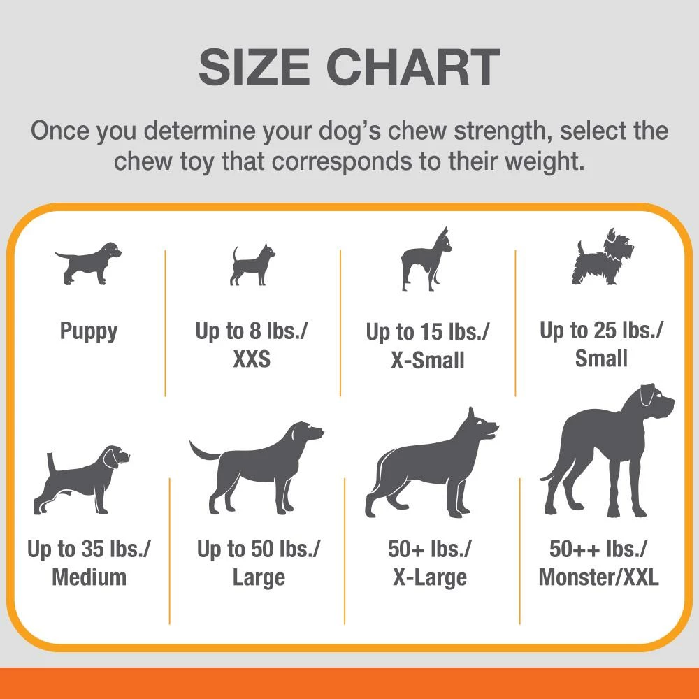 - Large chew toy – size giant chew toy intended for dogs up to 50 pounds
