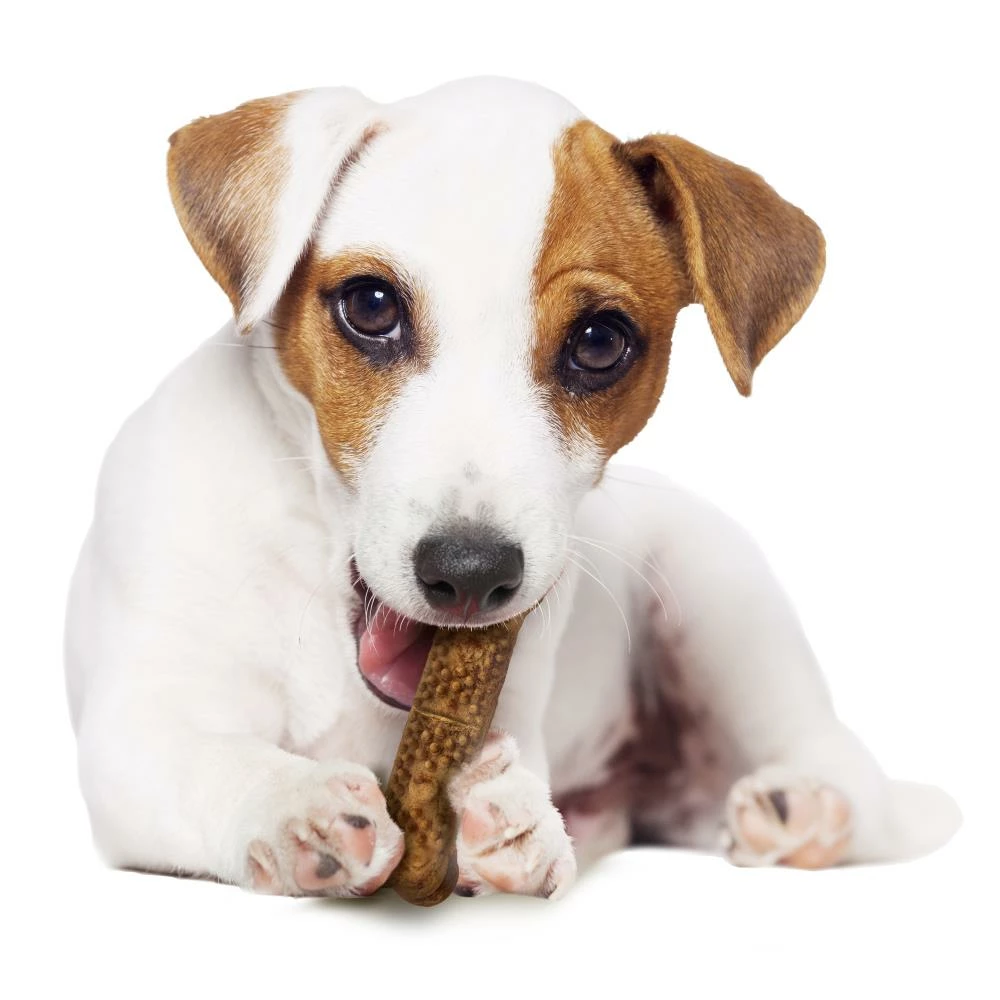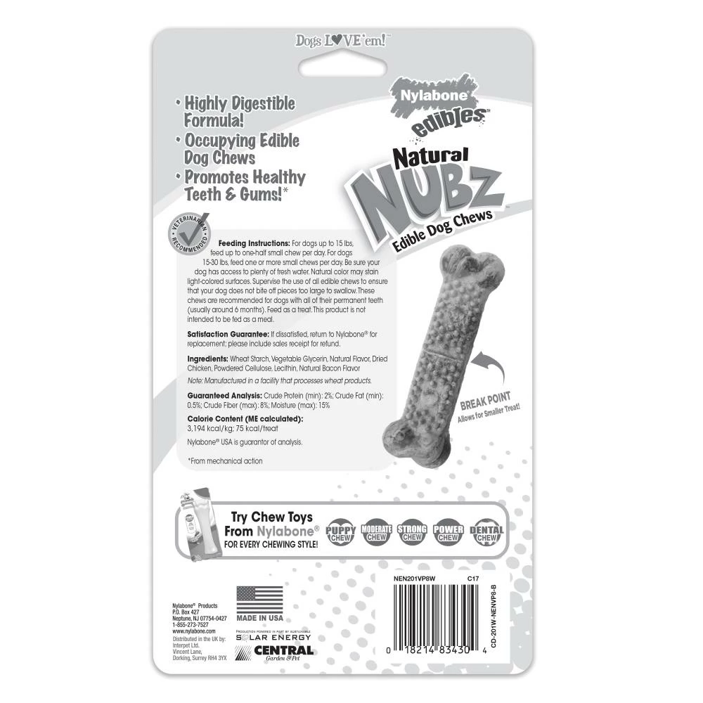 Satisfy your dog’s natural urge to chew with our delicious USA-made natural Nubz chicken dog treats! This wholesome snack is crafted with your dog’s health and taste buds in mind. That’s why these limited-ingredient treats contain real chicken and no artificial colors, flavors, or preservatives. Made with a highly digestible formula, these longer-lasting natural dog treats keep furry friends occupied and entertained. Each bone also features raised nubs that help promote clean teeth and gums, so your dog can enjoy a beautiful smile while chewing. Whether your furry friend is big or small, there’s a natural Nubz treat for dogs of every size.