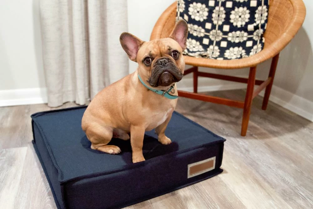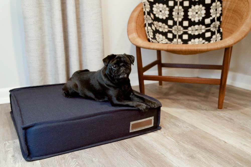 For pets with joint pain, or those that enjoy a firmer, platform-style napping place, our Orthopaedic Lounger is the perfect choice. The dense orthopaedic foam cushions pressure points and provides more body support than a poly filled dog bed. When muscles and joints ache, there’s nothing better than a good night’s sleep. Sewn in a beautifully textured navy Sunbrella fabric that is soft to the touch, durable, resists moisture, and is washable. There is simply no better fabric choice for a pet bed. We even tailored the seams with a mini-flange inspired by fine home furnishings. Each piece is made by hand in the USA and begins manufacturing the day you place your order. Thoughtfully designed with your dog and your home in mind, our orthopaedic Lounger bed performs as good as it looks.??We recommend measuring your sleeping pet to find the perfect bed size. Pets who curl up to sleep can fit on a smaller bed, while those who stretch out need a larger bed. To determine the ideal bed length, measure your pet in their typical sleeping position, then add 6-10” for the final bed size. When in doubt, we suggest ordering the size up. Please double check that you have chosen the correct size before placing your order.??Small: 22 in. x 22 in. x 6 in. high (dogs less than 30 lbs)?Medium: 28 in. x 28 in. x 6 in. high (dogs 30-60 lbs)?Large: 42 in. x 31 in. x 6 in. high (dogs 60-90 lbs)?X-Large: 48 in. x 36 in. x 6 in. high (dogs over 90 lbs)
