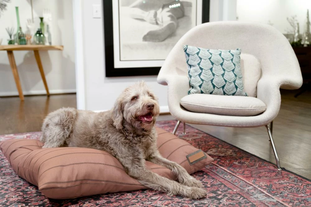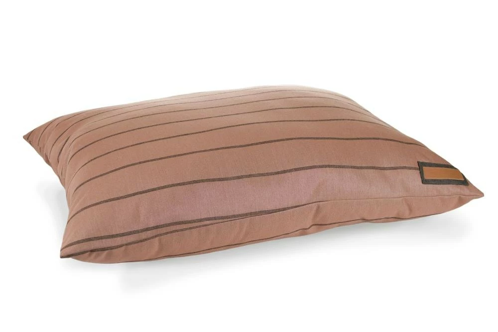 Treat your pooch to the most comfortable seat in the house. Your furry family members can sprawl, curl, lounge, and sleep to their heart’s content. Our pillow beds are over-stuffed with a proprietary fill made from recycled plastic water bottles that gives just the right amount to provide support and bounces back use after use. Tailored in a beautiful blush Sunbrella fabric, with a contrasting ticking stripe, that is soft to the touch, durable, resists moisture, and is washable. There is simply no better fabric choice for a pet bed. Each piece is made by hand in the USA and begins manufacturing the day you place your order. Thoughtfully designed with your dog and your home in mind, our pillow bed performs as good as it looks.??We recommend measuring your sleeping pet to find the perfect bed size. Pets who curl up to sleep can fit on a smaller bed, while those who stretch out need a larger bed. To determine the ideal bed length, measure your pet in their typical sleeping position, then add 6-10” for the final bed size. When in doubt, we suggest ordering the size up. Please double check that you have chosen the correct size before placing your order.??Small: 25 in. x 25 in. x 8 in. high (dogs less than 30 lbs)?Medium: 38 in. x 29 in. x 10 in. high (dogs 30-60 lbs)?Large: 47 in. x 37 in. x 10 in. high (dogs 60-90 lbs)