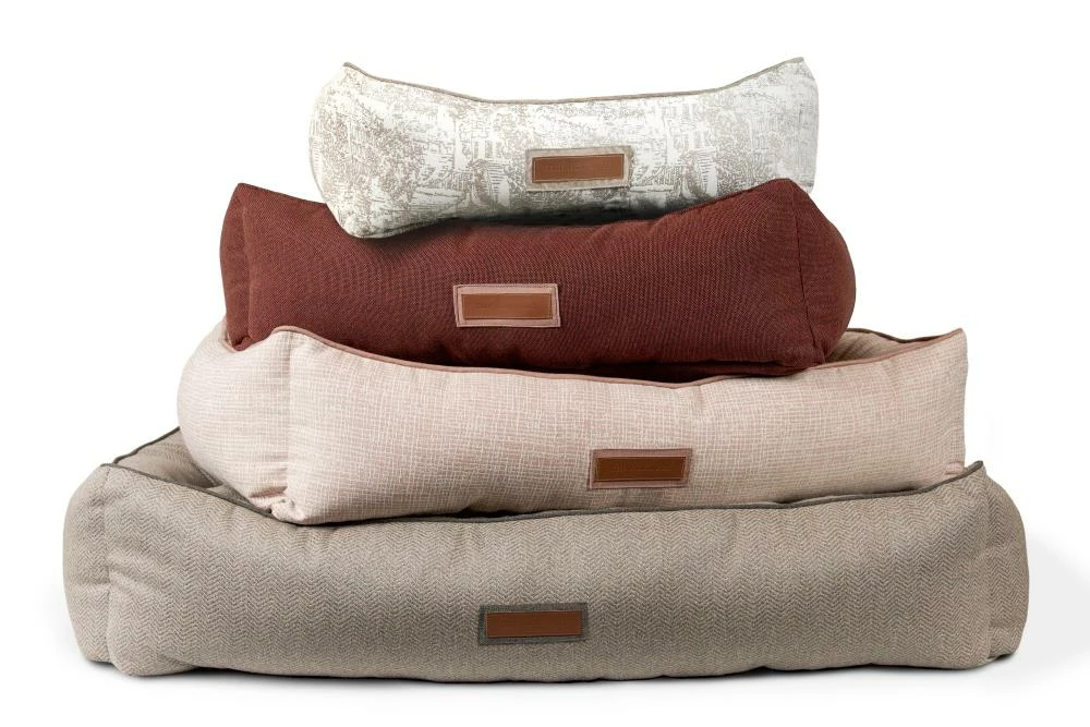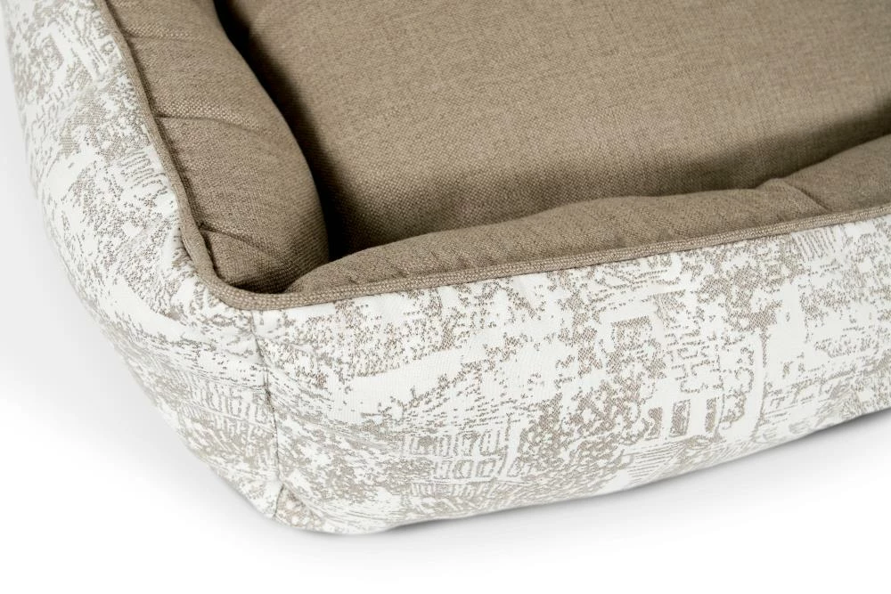 Snuggle much? For dogs that love to burrow behind cushions on the sofa, or disappear under the blankets on the bed, the Hugger makes a wonderful choice. Bolstered on all four sides, your hound is sure to find a comfortable corner to snuggle up to. The Hugger is our fluffiest, coziest bed. It’s over-stuffed with a proprietary fill made from recycled plastic water bottles that gives just the right amount to provide support and bounces back use after use. Sewn in beautiful oatmeal Sunbrella fabrics, with a classic toile pattern, that are soft to the touch, durable, resist moisture, and are washable. There is simply no better fabric choice for a pet bed. Each piece is made by hand in the USA and begins manufacturing the day you place your order. Thoughtfully designed with your dog and your home in mind, the Hugger bed performs as good as it looks.??We recommend measuring your sleeping pet to find the perfect bed size. Pets who curl up to sleep can fit on a smaller bed, while those who stretch out need a larger bed. To determine the ideal bed length, measure your pet in their typical sleeping position, then add 6-10” for the final bed size. When in doubt, we suggest ordering the size up. Please double check that you have chosen the correct size before placing your order.??Small: 24 in. x 18 in. x 7 in. high (dogs less than 30 lbs)?Medium: 30 in. x 25 in. x 8 in. high (dogs 30-60 lbs)?Large: 38 in. x 25 in. x 8 in. high (dogs 60-90 lbs)?X-Large: 44 in. x 36 in. x 10 in. high (dogs over 90 lbs)
