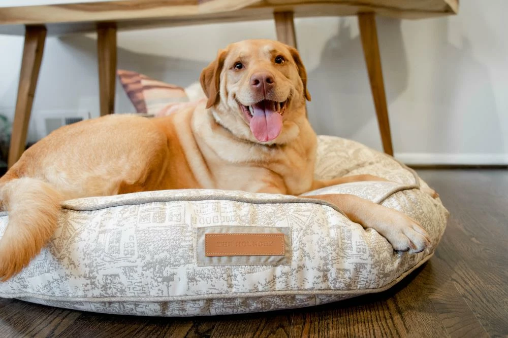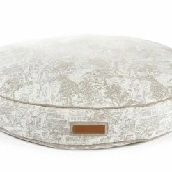 Have a dog who’s a freestyle sleeper? On their back one minute, belly the next, curled into a donut a minute later? Our round bed takes on all comers. Plush and responsive, the Round bed refuses to clump or flatten. It’s over-stuffed with a proprietary fill made from recycled plastic water bottles that gives just the right amount to provide support and bounces back use after use. Beautifully tailored in an oatmeal colored Sunbrella fabric, with a classic toile pattern, that is soft to the touch, durable, resists moisture, and is washable. There is simply no better fabric choice for a pet bed. Each piece is made by hand in the USA and begins manufacturing the day you place your order. Thoughtfully designed with your dog and your home in mind, our round bed performs as good as it looks.??We recommend measuring your sleeping pet to find the perfect bed size. Pets who curl up to sleep can fit on a smaller bed, while those who stretch out need a larger bed. To determine the ideal bed length, measure your pet in their typical sleeping position, then add 6-10” for the final bed size. When in doubt, we suggest ordering the size up. Please double check that you have chosen the correct size before placing your order.??Small: 24 in. x 24 in. x 8 in. high (dogs less than 30 lbs)?Medium: 31 in. x 31 in. x 8 in. high (dogs 30-60 lbs)?Large: 41 in. x 41 in. x 10 in. high (dogs 60-90 lbs)?X-Large: 48 in. x 48 in. x 11 in. high (dogs over 90 lbs)