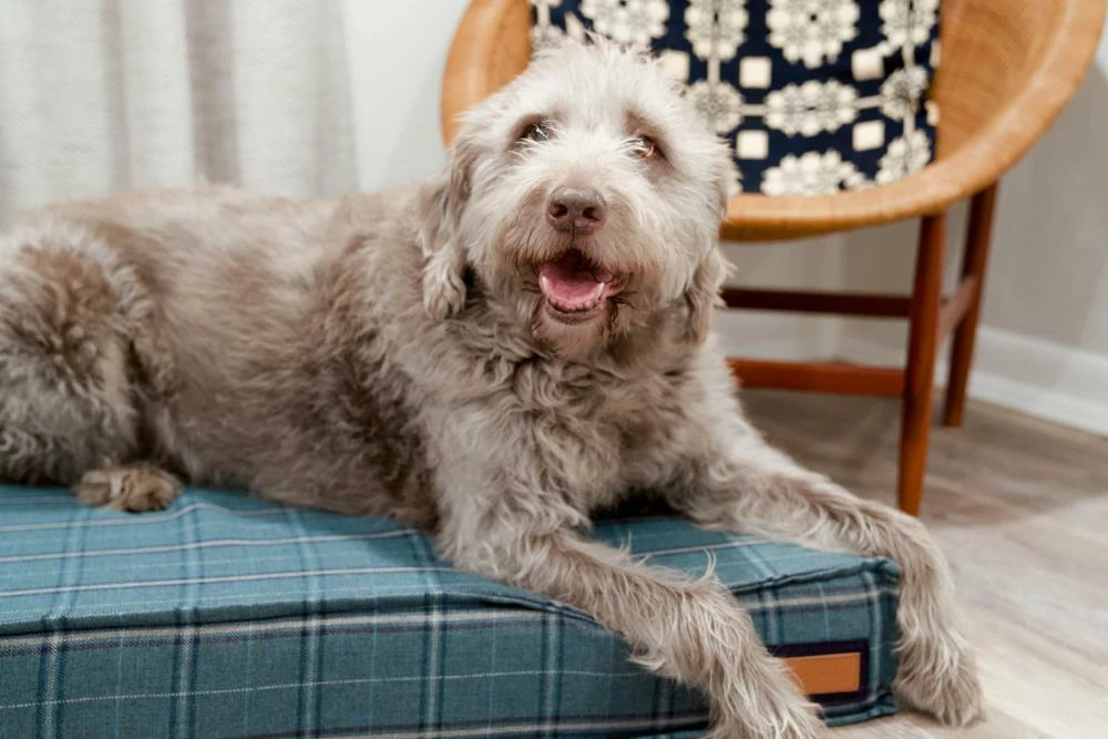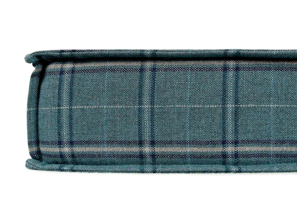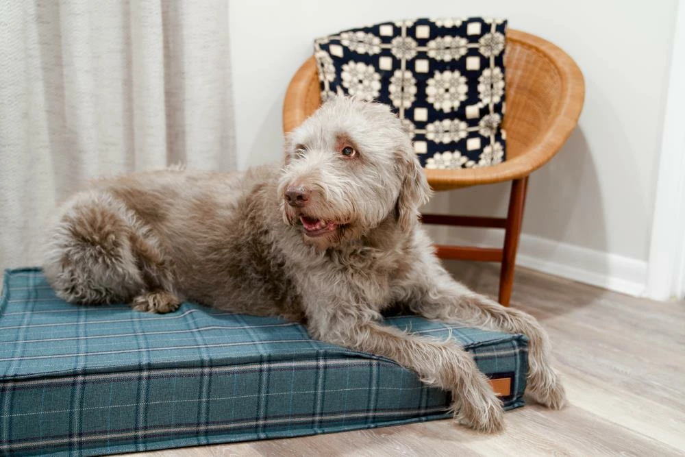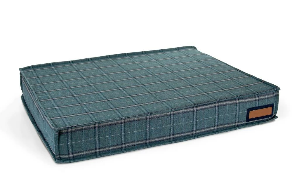 For pets with joint pain, or those that enjoy a firmer, platform-style napping place, our Orthopaedic Lounger is the perfect choice. The dense orthopaedic foam cushions pressure points and provides more body support than a poly filled dog bed. When muscles and joints ache, there’s nothing better than a good night’s sleep. Sewn in a rich teal Sunbrella fabric, with a vintage plaid pattern, that is soft to the touch, durable, resists moisture, and is washable. There is simply no better fabric choice for a pet bed. We even tailored the seams with a mini-flange inspired by fine home furnishings. Each piece is made by hand in the USA and begins manufacturing the day you place your order. Thoughtfully designed with your dog and your home in mind, our orthopaedic Lounger bed performs as good as it looks.??We recommend measuring your sleeping pet to find the perfect bed size. Pets who curl up to sleep can fit on a smaller bed, while those who stretch out need a larger bed. To determine the ideal bed length, measure your pet in their typical sleeping position, then add 6-10” for the final bed size. When in doubt, we suggest ordering the size up. Please double check that you have chosen the correct size before placing your order.??Small: 22 in. x 22 in. x 6 in. high (dogs less than 30 lbs)?Medium: 28 in. x 28 in. x 6 in. high (dogs 30-60 lbs)?Large: 42 in. x 31 in. x 6 in. high (dogs 60-90 lbs)?X-Large: 48 in. x 36 in. x 6 in. high (dogs over 90 lbs)