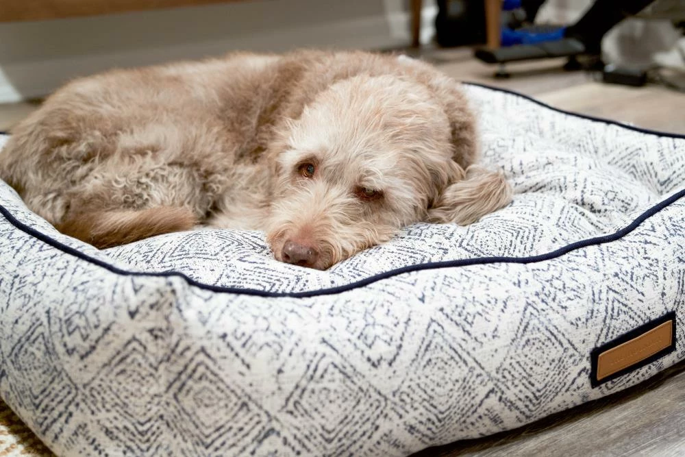 Snuggle much? For dogs that love to burrow behind cushions on the sofa, or disappear under the blankets on the bed, the Hugger makes a wonderful choice. Bolstered on all four sides, your hound is sure to find a comfortable corner to snuggle up to. The Hugger is our fluffiest, coziest bed. It’s over-stuffed with a proprietary fill made from recycled plastic water bottles that gives just the right amount to provide support and bounces back use after use. Sewn in a deep indigo Sunbrella fabric, with a distressed diamond pattern, that is soft to the touch, durable, resists moisture, and is washable. There is simply no better fabric choice for a pet bed. Each piece is made by hand in the USA and begins manufacturing the day you place your order. Thoughtfully designed with your dog and your home in mind, the Hugger bed performs as good as it looks.??We recommend measuring your sleeping pet to find the perfect bed size. Pets who curl up to sleep can fit on a smaller bed, while those who stretch out need a larger bed. To determine the ideal bed length, measure your pet in their typical sleeping position, then add 6-10” for the final bed size. When in doubt, we suggest ordering the size up. Please double check that you have chosen the correct size before placing your order.??Small: 24 in. x 18 in. x 7 in. high (dogs less than 30 lbs)?Medium: 30 in. x 25 in. x 8 in. high (dogs 30-60 lbs)?Large: 38 in. x 25 in. x 8 in. high (dogs 60-90 lbs)?X-Large: 44 in. x 36 in. x 10 in. high (dogs over 90 lbs)
