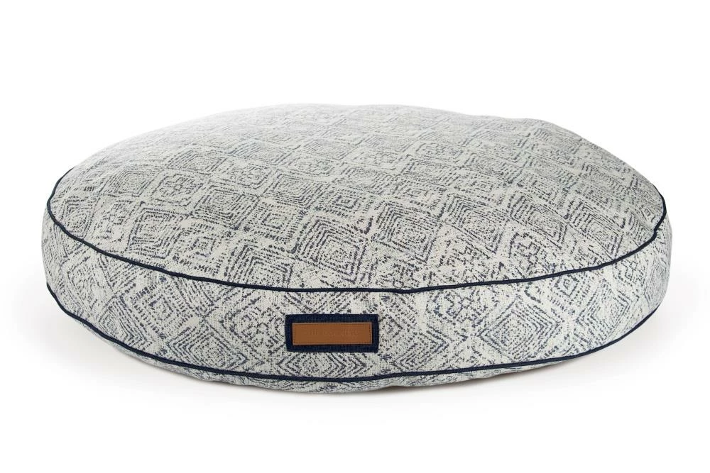Have a dog who’s a freestyle sleeper? On their back one minute, belly the next, curled into a donut a minute later? Our round bed takes on all comers. Plush and responsive, the Round bed refuses to clump or flatten. It’s over-stuffed with a proprietary fill made from recycled plastic water bottles that gives just the right amount to provide support and bounces back use after use. Tailored in a deep indigo Sunbrella fabric, with a distressed diamond pattern, that is soft to the touch, durable, resists moisture, and is washable. There is simply no better fabric choice for a pet bed. Each piece is made by hand in the USA and begins manufacturing the day you place your order. Thoughtfully designed with your dog and your home in mind, our round bed performs as good as it looks.??We recommend measuring your sleeping pet to find the perfect bed size. Pets who curl up to sleep can fit on a smaller bed, while those who stretch out need a larger bed. To determine the ideal bed length, measure your pet in their typical sleeping position, then add 6-10” for the final bed size. When in doubt, we suggest ordering the size up. Please double check that you have chosen the correct size before placing your order.??Small: 24 in. x 24 in. x 8 in. high (dogs less than 30 lbs)?Medium: 31 in. x 31 in. x 8 in. high (dogs 30-60 lbs)?Large: 41 in. x 41 in. x 10 in. high (dogs 60-90 lbs)?X-Large: 48 in. x 48 in. x 11 in. high (dogs over 90 lbs)